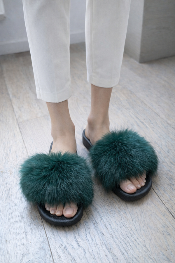 Claquettes en vraie fourrure de renard – Vert sapin