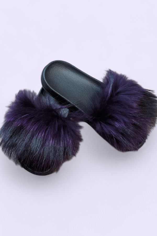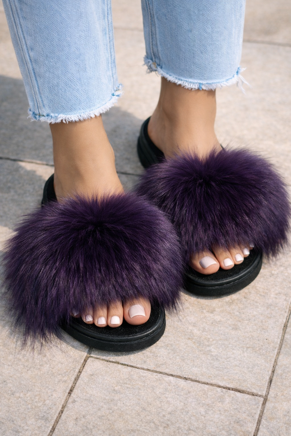 Claquettes en véritable fourrure de renard – Violet profond